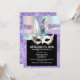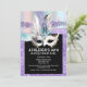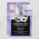 Uma fantasia inspirada por um olho branco adornado com diamantes e delicadas decorações de ornamentados tem bonito penas brancas, azuis e de bronze pálido. Ela é colocada contra um cinzeiro sujo, iridescente brilhante e fundo brilhante roxo que o faz pop. Modelos de texto editáveis brancos aparecem abaixo da máscara para seu texto personalizado. São ideais para uma solteira, aniversário, 16 doces; marco ou quinceanera.