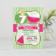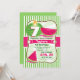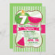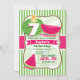 Melancia rosa-branca e verde, convite de aniversário de criança de verão, menino ou menina em um plano de fundo brilhante verde e listras brancas. Personalize este bonitinho, convide com o nome do seu filho. Possui uma vela de 7, sétimo aniversário do que pode ser personalizada para a idade do seu filho. Perfeito para o aniversário do bebê, criança, crianças pequenas ou crianças mais velhas. Convite para excelente para melancia, fruta, festa de aniversário temática de verão comida.