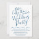 O texto típico do moderno texto azul marinho simples em um convite de casamento design branco de fundo lê melhor tarde do que nunca festa de casamento. Simples design moderno contemporâneo, personalize com seu próprio local de casamento atrasado após a festa de casamento, noivas e nomes de noivos e responda detalhes na frente e sua foto favorita de casamento do dia do seu casamento no sentido inverso. Produtos de casamento e outras opções de cores disponíveis na loja. © Design por Sarah Trett para www.mylittleedenweddings.com