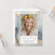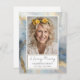 Elegante Faux dourado azul-aquarela Uma Foto Memorial / Funeral / Celebração da Salvação da Vida. Fácil de ajustar com as suas próprias informações de fotografia e texto. A parte traseira da placa pode ser excluída e vazio esquerdo, adicione seu próprio texto de bíblia favorito, adicione outra foto ou adicione seu poema favorito. Modelo com o verso da bíblia KJV John 14:1-3. Foto de preenchimento criada com o software AI. Mude para sua própria foto.