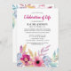 Uma celebração ocular do convite ao funeral de vida, com flores vibrantes de aquarela em um fundo branco clássico e um modelo elegante de anúncio memorial que pode ser facilmente personalizado.
