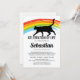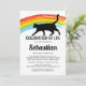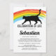 Convite de serviço memorial funerário de gato com um fundo branco simples, uma ponte do arco-íris colorida, uma silhueta de um gato e um modelo de celebração da vida fácil de personalizar.