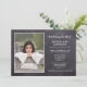 Funeral Rustic Chalkboard/Celebração Do Convite À Vida. Estes convites para festas de simpatia apresentam uma foto no quadro de chalkboard em uma cinza e design branca. Personalize esta celebração do convite para o funeral de vida com as fotos, nomes e datas de seus entes queridos, detalhes do evento. COPYRIGHT © 2021 Judy Burrows, Black Dog Art - Todos Os Direitos Reservados. Memorial Rustic Foto Celebração Do Convite Funeral À Vida