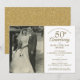 Personalize com a sua foto de casamento favorita e as suas memórias especiais do 50º aniversário de casamento, factos e detalhes da celebração em tipografia dourada elegante. O verso apresenta confetes de coração de amor dourado. Concebido por Thisisnotme©
