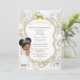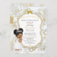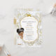 Linda menina de vestido branco, véu e colar de cruz de ouro. O fundo do convite é o cetim branco, o filigre dourado, um quadro dourado e brilhante prateado e um arco embelado. A parte de trás é enfeitada com um padrão de flor dourada e uma faixa dourada em um fundo branco.