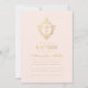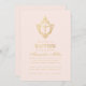 Este elegante convite para o batismo cor-de-rosa e dourado com ar de safra, recomendado para o batizado de menina, tem uma crista floral vintage com uma cruz dentro, em folha de ouro falso. O nome da garota está escrito em um roteiro caligráfico elegante. Todo texto pode ser personalizado e tem uma cor de ouro semelhante à crista falsa de ouro. O plano de fundo é cor-de-rosa-claro. A crista floral vintage de uma antiga ligação ao cobrir, do livro "Rust, Smut Mildew & Mold", de 1870, agora no dominio público.