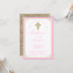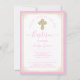Convites de batismo elegantes em rosa bebê e dourado com lindo crucifixo dourado em um fundo com borda rosa e dourada. Este convite de batismo para menina é facilmente personalizado para o seu evento, adicionando seus detalhes. Você também pode mudar a cor do rosa para a cor que preferir. Você pode remover o fundo com impressão brilhante do verso e adicionar a cor de sua escolha a este lindo convite versátil. Você também pode remover a pérola rosa do crucifixo, se preferir.