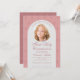 Um convite de batismo moderno para o batizado de uma menina. Sobre um fundo rosa poeira, com um padrão de cruzes rosa poeira escuras e pequenas, há um arco branco com uma foto redonda da menina e texto rosa poeira no interior. A ocasião Primeira Comunhão e o nome são escritos em uma elegante caligrafia; a primeira linha, acima da foto, é um texto arqueado. No verso, o padrão é invertido, com cruzes rosa claro sobre um fundo rosa poeira mais escuro.
