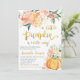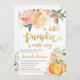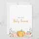 O convite inclui uma abóbora laranja com flores rosadas e laranja. Este design é perfeito para um chá de fraldas com tema de queda.