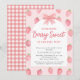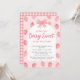 Este convite de baby shower temático de morango para menina apresenta morangos em aquarela e tipografia em letra cursiva rosa em um fundo em arco. A parte de trás é decorada com um xadrez gingham rosa. Diz "Alguém Muito Doce Está a Caminho" e é facilmente personalizável. Aquarela Original © Michele Davies