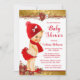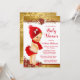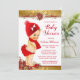 Convites de chuvada de bebê de Natal com adorável bebê loira vestindo um lindo traje vermelho em um lindo fundo de poinsettia vermelho e dourado. Este convite de chuvada de bebê de Natal é facilmente personalizado para o seu evento, basta adicionar o texto necessário para o seu evento.