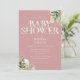 Um convite de chá de bebê elegante com tipografia elegante e folhagem botânica bonita em um fundo rosa poeira. Criado por Thisisnotme©