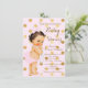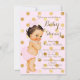 Convite de chá de bebê rosa e dourado com adorável bebê morena de cabelo escuro vestindo um traje com estampa de bolinhas com um colar de pérolas em um belo fundo pontilhado cor-de-rosa e dourado. Este convite de chá de bebê rosa e dourado é facilmente personalizado para o seu evento, adicionando os seus detalhes no estilo de letra, cor e formulação de sua escolha. Você também pode remover a camada rosa e adicionar a cor de fundo de sua escolha. Este é um design impresso sem nenhum tipo de lâmina ou pérolas reais, etc.
