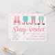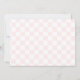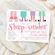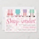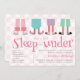 Um convite de festas de pijama de aniversário com uma ilustração de quatro pares de pés vestindo flamingo, urso, gato e sapatilhas de coelho. Os pijamas têm um esquema pastel. O plano de fundo é o padrão rosa da prancha de xadrez.