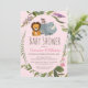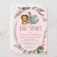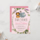 Este design bonitinho apresenta um leão, macaco e um rinoceronte rodeados por um padrão de folha botânica com flores roxas e cor-de-rosa contra um fundo de rosa claro. Essa tipografia popular pode ser personalizada para mudar a cor e o estilo da fonte ou mantê-la como é para sua conveniência. Tão fofo para um chá de fraldas de menina.