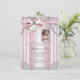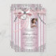 Foto rosa primeiro convite da comunhão com elegante prata e cinza de fundo e pérolas bonito e arco rosa com cruz e coração, e bela imagem rosa para sua foto. Este belo convite de primeira comunhão cor-de-rosa é facilmente personalizado para o seu evento, simplesmente adicionando a sua fotografia e os detalhes do evento no estilo de letra, cor e redação da sua escolha. Você pode recortar sua foto e mover o quadro para onde você precisar, à medida que a tornamos menor ou maior. Esta é uma design impressa sem fitas, arcos, pérolas, brilho, etc.