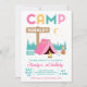 Meninas rosa modernas acampando no dia de aniversário Estimada Convocação Meninas coloridas acampando o convite de aniversário que poderia ser usado em qualquer idade com uma grande tenda cor-de-rosa, tenda rosa, fogo no acampamento, cartaz e muito mais. Ideal para uma festa de aniversário temática de acampamento para uma garota.