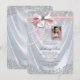 Convite de primeira comunhão rosa com cetim branco elegante e pérolas e laço rosa bonitos com cruz e coração, e bela moldura de foto rosa para a sua foto. Este lindo convite de primeira comunhão branco é facilmente personalizado para o seu evento, basta adicionar a sua foto e detalhes do evento no estilo de fonte, cor e texto de sua escolha. Você pode cortar sua foto e mover a moldura para onde precisar, bem como torná-la menor ou maior. Este é um design impresso sem fitas, laços, pérolas, brilho, etc. reais.
