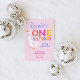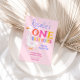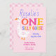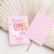 Celebre o seu grande dia com este adorável e caprichoso convite para primeiros aniversarios! Apresentando um ganso de bobo divertido e uma tipografia colorida e divertida, este doce design é perfeito para a primeira celebração de aniversário de uma menina. A parte traseira da placa é terminada com um padrão de gingham cor-de-rosa coordenado, adicionando um toque bonito inspirado na fazenda. Uma escolha encantadora para uma festa de aniversário em casa ou em casa de fazenda!