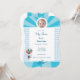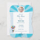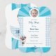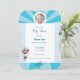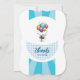 Convite alegre para chá de bebê com cores branca e azul. No topo, um bebê voando carregado em balões. Uma bela lembrança da ocasião mais linda
