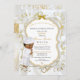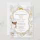 Belo menino em seu terno batizante com colar de cruz de ouro e chapéu embelezado de ouro. O fundo do convite é o cetim branco, o filigre dourado, uma moldura dourada e prateada e um embelezamento do arco. A parte de trás é enfeitada com padrão de flores douradas e fita dourada sobre fundo branco de cetim.