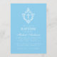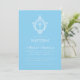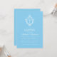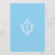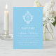 Este convite de batismo azul e branco elegante, com um ar vintage, recomendado para um menino, tem um brasão floral vintage com uma cruz branca. O nome da criança é escrito em uma fonte caligráfica elegante. Todo o texto é branco e pode ser personalizado. O fundo é azul bebê (um tom claro de azul).