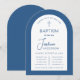 Um convite para o batismo moderno, arquitetado, azul e branco. Na parte superior há uma cruz com texto arquivado acima dela. O primeiro nome é escrito em script, acima do segundo nome. As informações da cerimônia e as informações de recepção estão em duas colunas separadas por uma linha. O texto, as linhas e a cor do arco é azul clássico, o fundo é branco.
