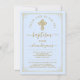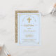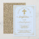 Convites de batismo azuis e dourados para menino com linda cruz dourada e fundo com borda dourada. Este convite de batismo azul e dourado é facilmente personalizado para o seu evento adicionando seus detalhes. Você também pode alterar a cor do texto e do fundo para qualquer cor que preferir. Você pode remover o fundo com impressão brilhante do verso e adicionar a cor de sua escolha a este lindo convite versátil.