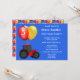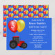 Este convite de festa de aniversário apresenta balões coloridos e um trator vermelho. Personalize este convite com a idade da sua criança e informações da festa. O fundo deste convite é azul, se preferir outra cor há muitas para escolher.