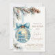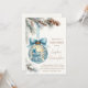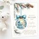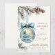 Celebre a chegada iminente do seu bebê menino com este convite de chá de bebê temático de maravilhoso mundo invernal! Com um adorável berço azul e uma cadeira de balanço dentro de um enfeite natalino brilhante, este design cria uma atmosfera mágica e aconchegante de inverno. Ramos de pinheiro macios, pinhas e uma fita azul adicionam ao charme festivo, tornando-o o convite perfeito para um chá de bebê de inverno.