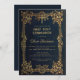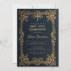 Este convite de primeira comunhão azul e elegante, com um ar vintage, apropriado para um menino, tem uma moldura dourada antiga feita de folhas de ouro e videiras (e algumas bagas douradas) em um fundo azul-marinho. Há uma cruz dourada na parte superior da moldura, acima do texto, com uma coroa dourada atrás dela. O nome da criança é escrito em uma fonte caligráfica elegante. Todo o texto pode ser personalizado e tem uma cor dourada semelhante às decorações douradas da moldura.