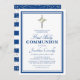O primeiro convite da comunidade sagrada de Menino com um simples fundo branco que pode ser mudado para qualquer cor, uma fronteira dupla azul marinho, uma cruz prateada religiosa com flores brancas, e um modelo de comunhão sagrado que é fácil de personalizar. A parte de trás apresenta faixas náuticas azuis e brancas, e brilho prateado.