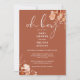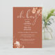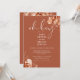 Um convite de chá de bebê elegante e sofisticado com tipografia elegante e folhagem rústica botânica bonita em um fundo de terracota. Criado por Thisisnotme©