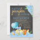 Rapazes, pequenos chuveiros de bebês de abóbora, com bonito abóboras azuis, laranja e douradas e balões em fundo de quadro com texto azul e dourado. Você pode personalizar facilmente este adorável convite de chá de fraldas de abóbora para seu evento simplesmente adicionando seus detalhes. Este é um design impresso sem folha de alumínio, arcos, etc.