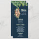 Carteira de menu - mesa d'hote com uma design de aquarela fofinha, com preguiça aguda pendurada num galho de árvores rodeado por folhas tropicais verdes. Fundo azul escuro.