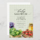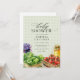 Celebre a chegada de um pequeno broto com este charmoso Convite para Chás de fraldas do Mercado de Agricultores Frescos! Apresentando ilustrações de aquarelas pintadas manualmente de cestos brimando com tomates maduros, alface nítida, e frascos de mel e geleia, esta design traz a beleza sã de um mercado local para o seu evento. O fundo verde de gingham macio adiciona um toque rústico, convidando a completar a estética fazenda a mesa.