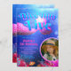 Este convite usa azul e rosa como paleta de cores principal. A profundidade no design é dada atenção fazendo com que os peixes pareçam muito distantes do ponto de vista focal principal. Efeitos de iluminação são usados especialmente na cauda da sereia, para torná-la a estrela do design