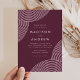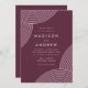 Convites modernos de casamento, com linhas geométricas roxas leves e roxas nos cantos com um fundo roxo. Personalize os convites de casamento de merlot, adicionando seus nomes e detalhes de casamento. Os convites modernos para casamento de boho invertem-se para mostrar um fundo cor de merlot.