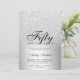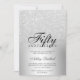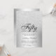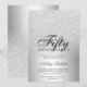 Um design de folha metálica luxuosa e glitter prateada com elegante tipografia caligráfica para um convite de aniversário 50 e fabuloso.