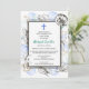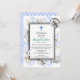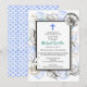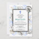 Uma coleção de conchas marinhas cerca uma moldura dupla simples neste convite de batismo. Uma cruz azul acentua o topo. A parte de trás tem um padrão de mar para completar o tema.
