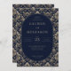 This is a classic style image featuring an elegant wedding invitation for Lauren and Benjamin. The design showcases intricate gold floral patterns on a deep navy background, creating a luxurious and sophisticated look. The oval centerpiece elegantly displays the couple's names along with the date and venue details in crisp white text. It exudes a sense of timeless elegance and formality, perfect for setting the tone for a grand celebration. Ideal for those seeking a traditional yet refined aesthetic for their special day.