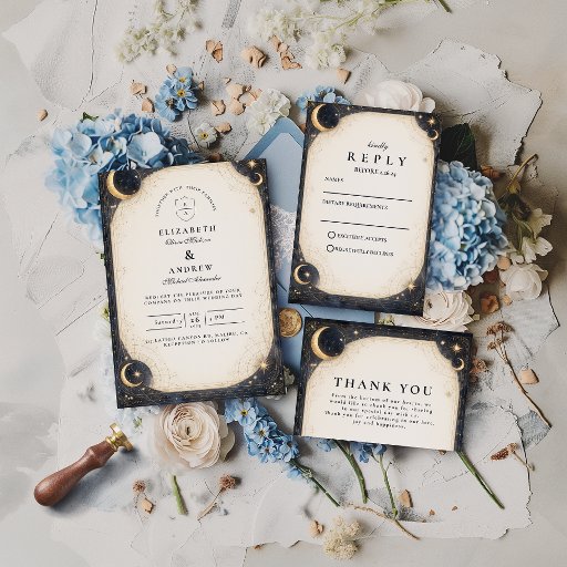 A romantic celestial wedding collection inspired by midnight skies, golden constellations, and elegant night-garden details. Deep navy tones, soft ivory parchment, and delicate gold accents create a timeless, luxurious look perfect for evening ceremonies, formal celebrations, and modern classic weddings. Designed to feel refined, magical, and effortlessly sophisticated.