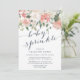 O convite elegante e moderno para a pulverização de bebês florais apresenta um buquê de rosas de aquarela pastel macia, peonias e híbridos em tons de rosa-pincel, pêssego e creme, com folhas botânicas verdes e eucalipto. Personalize com os detalhes do seu bebê aspersor em letras azuis elegantes e enfumaçados acentuadas com caligrafia de estilo manuscrito.
