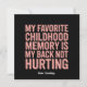 Viva os bons velhos tempos com a frase hilária "Minha Memória de Infância Favorita É Minhas Costas Sem Machucar." Uma design engraçada que capta perfeitamente o tempo que todos sentimos falta — quando nossas memórias favoritas não envolviam dor nas costas! Texto de piada para risadas e nostalgia.