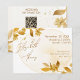 Minimal Autumn Golden Botanical Script Wedding Invitation. This minimal wedding invitation features flowing script names paired with soft autumn gold botanical accents and a light parchment-style wash. The design balances warmth and simplicity, allowing the couple’s names to feel personal while keeping the overall layout clean and modern. The reverse side includes a matching layout with a QR code, website link, and RSVP details for easy guest responses. Subtle gold tones and airy spacing create a calm, refined look that works beautifully for elegant, relaxed, or contemporary weddings.