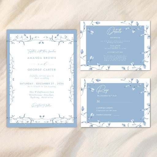 Convite Minimalist Dusty Blue Chinoiserie Floral Wedding