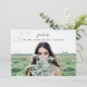 Um convite para fotos de formatura que mostra sua foto na frente com texto preto no topo. O lado oposto é a cinza escura com texto branco.