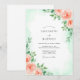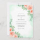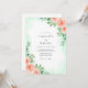 A delicate watercolor wash in mint green provides a soft and airy backdrop for this design. Hand-painted peach roses and sage green foliage adorn the edges, creating a fresh spring aesthetic. These romantic botanical elements evoke a sense of natural elegance for a seasonal wedding.