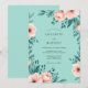This design features a soft mint green background adorned with lush peach peonies and delicate coral blossoms. Deep teal and sage green foliage create a graceful aesthetic across the layout. The watercolor artwork evokes a fresh and romantic mood, perfect for a spring or summer event.