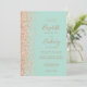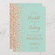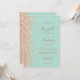 The left-hand edge of this elegant modern wedding invitation features a peach faux glitter border. The customizable text combines handwriting, copperplate and italic fonts on a mint green background. The reverse side features a matching mint green and peach design.